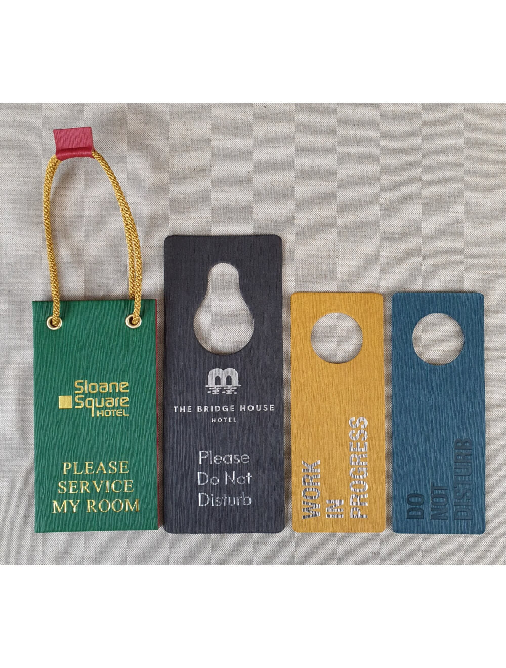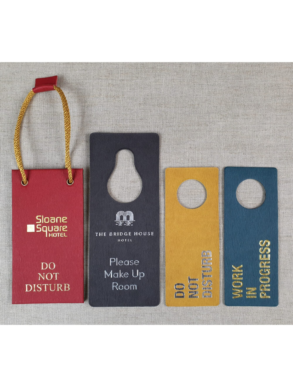 Design your own bespoke door hangers in a wide choice of colours. Our Paris range of material is a luxury modern grained finish which is great for embossing or adding a foil print. These items are widely used in Hotels around the world to confirm if a room is wanted servicing, the customer wishes for the room to be serviced or by cleaning and maintenance staff to confirm the room is being worked on.
